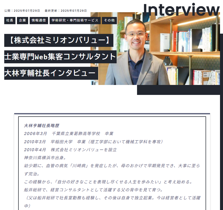 >> 【株式会社ミリオンバリュー】士業専門Web集客コンサルタント 大林亨輔社長インタビュー(The Leader 掲載ページ)